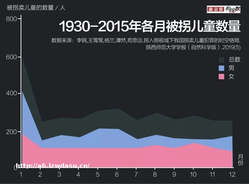 统计1930年到2015年的被拐卖儿童,拐卖峰值出现在1月,其他月份波动较小,但无论哪个月被拐卖的男童都多于女童。