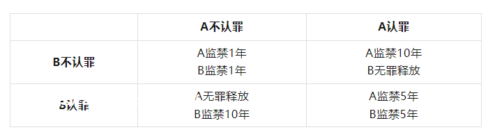 「囚徒困境」是一个**的**示例,假设有两个囚徒 A 和 B,如果双方都不**,那么都监禁 1 年;如果双方都**,那么都监禁 5 年;如果一方**,另一方不**,那么**的一方马上释放,不**的一方监禁 10 年。