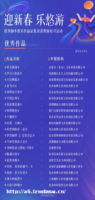 “迎新春 乐悠游”**剧本**作品在“欢欢喜喜过大年”2024年**春节文化和旅游消费月主场活动上正式发布。经过专家评审,《祥龙献瑞》《节日大作战》《天官赐福》《食为天》等20部作品入选。