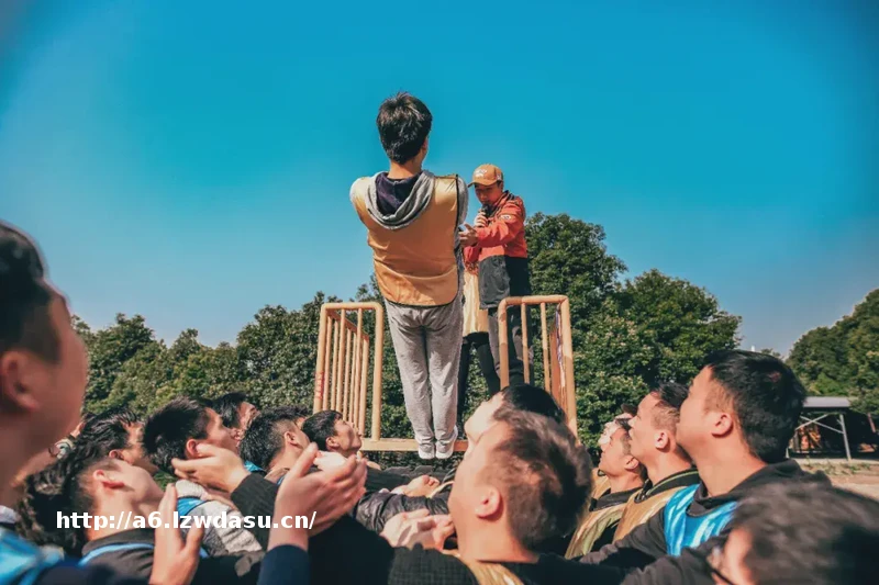 游戏玩法:站在高台上,双手被绑,身体正直地向后倒下,倒落在下面队友的手臂中。