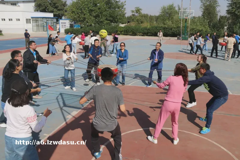 游戏玩法:团队的每个人都手持一条绳子以鼓为中心围成一个圈,在同节奏下一起晃动绳子,紧接摇动鼓来击起鼓面上的球,大鼓连续颠球20个即挑战成功。