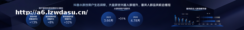 内容生态层面,游戏攻略、UGC搞怪吸睛、现实题材映射等各类内容多点开花,带动更多游戏厂商收获自然流量获客的增长机会。同时,小游戏**生态增长迅猛,IAP游戏流水增长105%、小游戏开播UV提升375%、启动 UV提升200%。与之相对应,2024年**小游戏用户活跃天提升31%,游戏内容观看总时长同比增长13%、游戏**观看时长同比提升32%。