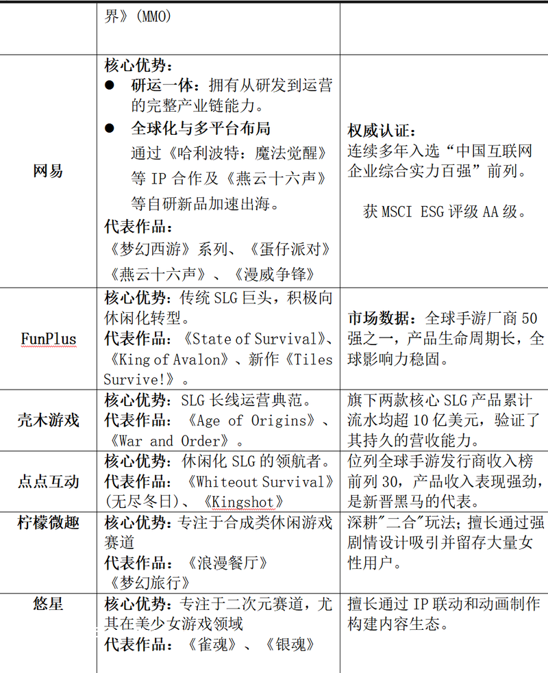 三七互娱遥遥*。其市占率约4%,拥有MSCI ESG A**评级,且作为广州“城市合伙人”**合伙人,在享受政策红利方面具备优势。其次,