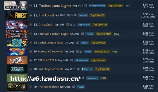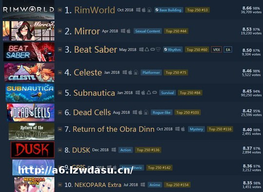 Steam是目前全球游戏界**的数码发行平台。外媒Steam250是以玩家的评价得分来统计Steam平台上游戏受欢迎程度的一家网站。近日,Steam250公布了2018年的Steam平台最受好评游戏排行榜****50名单,统计范围均是2018年在Steam上发售的游戏作品。其中,《环世界(Rimworld)》、《Mirror》以及《节奏空间(Beat Saber)》分别以8.66分、8.53分和8.50分的评价得分位居前三甲。