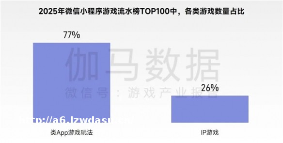 小程序游戏领域,现阶段类App游戏玩法的数量占比已达77%,IP游戏占比达26%。