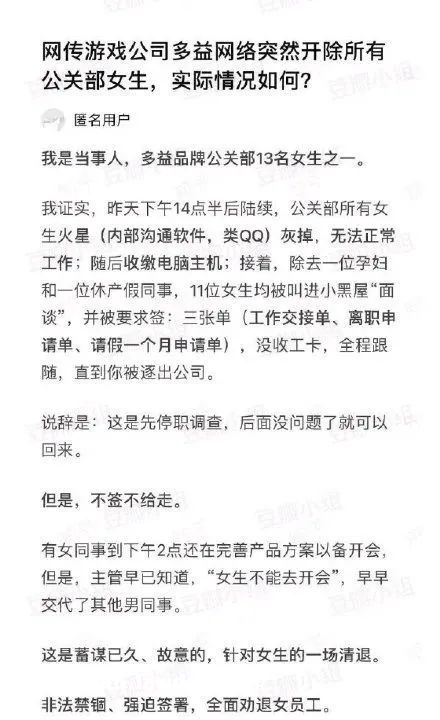 该名员工称,多益这是蓄谋已久、针对女生的一场清退、