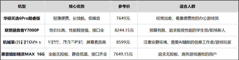 2026 年的 5000 元档游戏本市场,已经不再是“将就”的选择。联想拯救者 Y7000P、华硕天选 6 Pro 酷睿版、惠普暗影精灵 MAX、机械革命耀世 16 Ultra 四款产品,以不同的产品哲学诠释了“*价比高的游戏本”的多元内涵——*能释放、便携续航、屏幕素质、静音体验,没有**的优劣,只有与需求的契合。