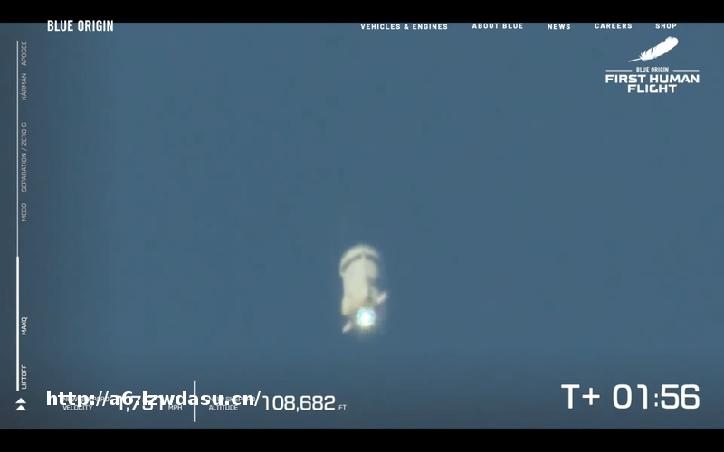 一切都按照计划成功地进行。美国东部时间7月26日上午9点,“新谢泼德”号在位于埃尔帕索东南部的西德克萨斯沙漠的发射架上垂直点火起飞,将顶端的载人舱推上高空,而后与载人舱分离,以反推方式垂直落回着陆场。