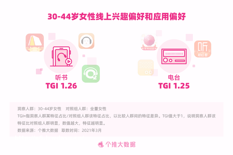 相比全量女,30-44岁女更喜爱“电台”这种伴随媒介,对“听书”偏好明显。抓紧短暂的闲暇时光追正在更新的广播剧、听一本经典**或回味一首老歌,她们懂得在生活的柴米油盐和锅碗瓢盆之外,享受真正属于自己的小时光。