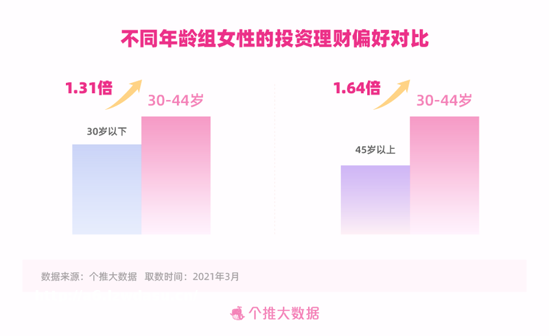 值得一提的是,相比其他年龄段的女,30-44岁的姐姐们更敢于尝试高风险和高收益并存的****,“财商”了得。