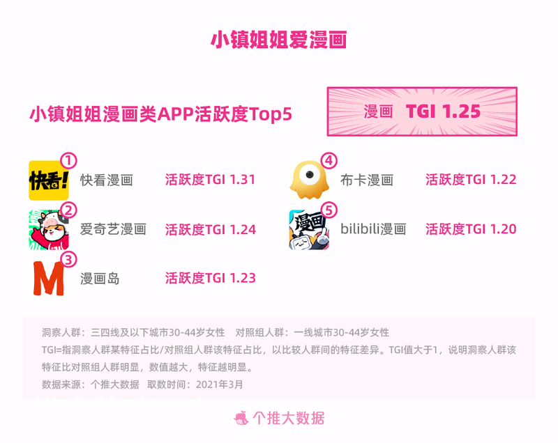 同时,在其他阅读偏好方面,我们发现,相比更喜欢看“新闻资讯”的一线城市30+姐姐们,小镇姐姐更偏爱漫画以及轻松搞笑类的内容。在妈妈、妻子的多重角背后,小镇姐姐仍然怀有一颗粉红的少女心。快看漫画、爱奇艺漫画、漫画岛、布卡漫画、哔哩哔哩漫画,