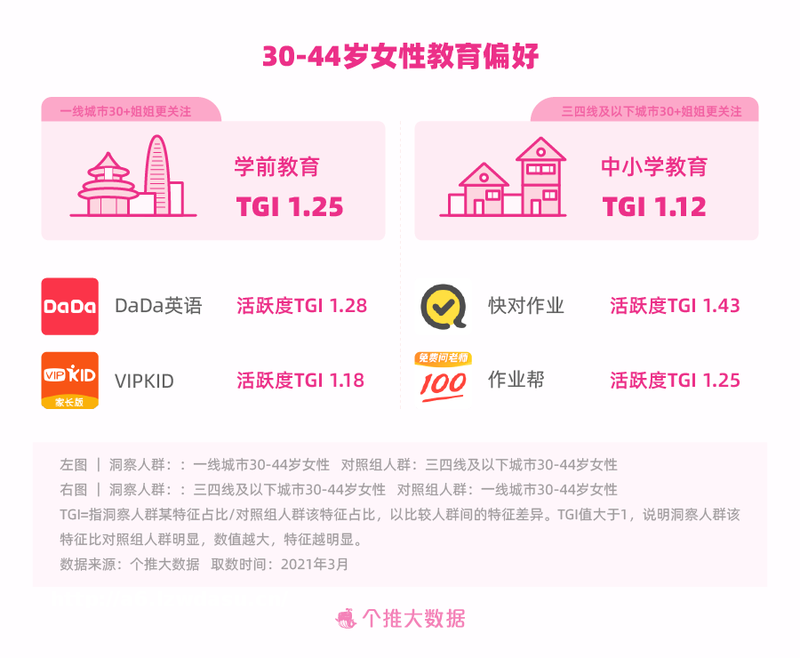 我们还从更细分的城市维度,对30-40岁年龄段宝妈们的教育现状进行了洞察。一线城市30-44岁的宝妈们“学前教育”属更明显,也更重视培养孩子的英语交流能力,