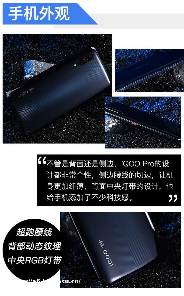 除了外形的**设计外,iQOO Pro的细节设计也同样彰显vivo的功力。整个手机最特别的地方就是背部**的那条RGB灯带。当灯带没有点亮的时候,你并不会发觉这条灯带的存在,因为它**在背部对撞的光轨**。
