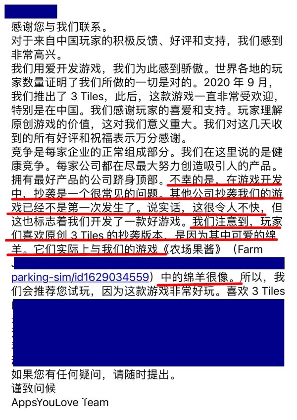 就此事,在游戏开发过程中,抄袭是一个常见的问题。其他公司抄袭他们的游戏已经不是**次发生了,这很令人不快。此外,针对《羊了个羊》涉嫌抄袭一事,《3 Tiles》的开发团队说道:“我们注意到,是因为其中可爱的绵羊。它们实际上与我们某个游戏中的绵羊很像。”