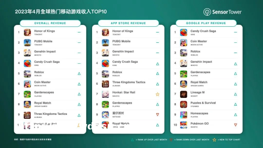 1.《王者荣耀》2.《PUBGM》3.《原神》4.《糖果传奇》5.《罗布乐思》6.《金币**》7.《梦幻花园》8.《皇家比赛》9.《三国志战略版》10.《崩坏:星穹铁道》