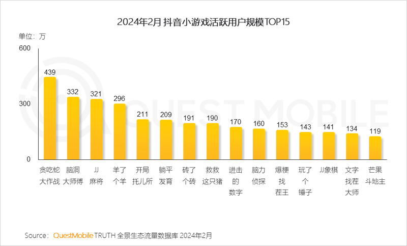 以**小游戏为主的小游戏平台,逐渐成为下一个小游戏潜在增长点。从目前情况来看,**小游戏凭借**平台发挥着内容优势,全面发力小游戏市场。今年2月,头部**小游戏已经获得百万活跃用户规模,其中《贪食蛇大作战》月活用户规模高达439万,而《脑洞**傅》《JJ**》等小游戏产品的月活用户规模均超过300万。