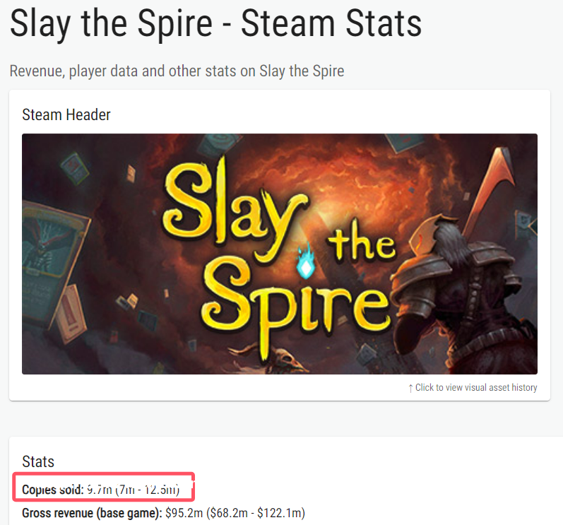 认为《杀戮尖塔》的Steam销量大约在600万至1000万之间。考虑到其还登陆了主机与移动端,因此其全平台累计销量普遍被认为已达到千万级,