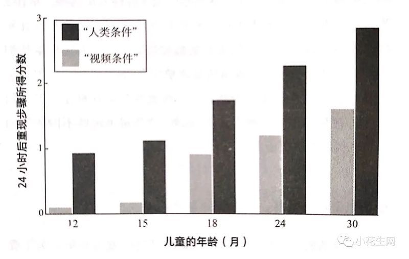 一项常被引用的研究工作证明了这一点。研究者采取了**演示和视频播放两种方式,让一批12—18个月孩子们在学习动作的24小时后对玩偶做出特定动作。结果显示,“观看视频”学习的孩子表现均较差。