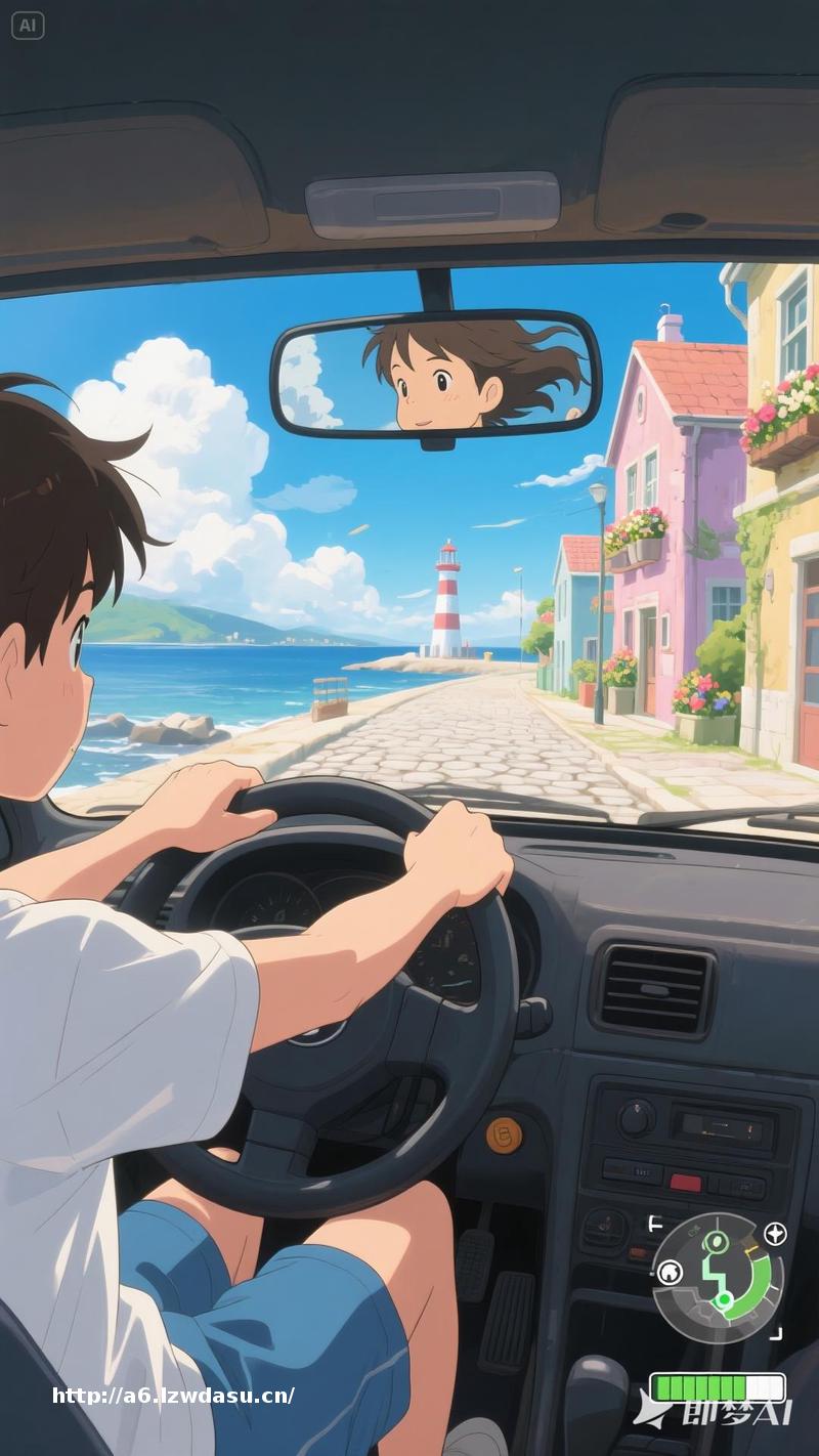 提示词:First-person POV video game screenshot, playing as a young anime protagonist in a slightly oversized white t-shirt and knee-length blue shorts. View includes visible hands gripping a steering wheel, sunlit arms resting on car door, and rearview mirror showing character's soft Ghibli-style face with windblown hair. Driving through a vibrant coastal town: cobblestone streets, pastel houses with flower boxes, distant lighthouse. Soft painterly textures, Miyazaki skies with fluffy clouds, slight fisheye lens effect, HUD elements (mini**p corner, health bar).