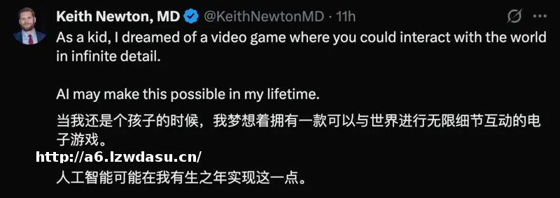 她配文称,如果能够通过提示词创建自己的虚拟世界,那将会非常震撼,由此暗示了 AI 在游戏开发,特别是生成动态、沉浸式的虚拟环境中的潜力。