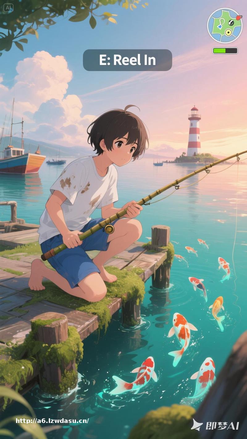 提示词:First-person POV video game screenshot, playing as a young anime protagonist in a slightly oversized white t-shirt (salt-stained sleeves) and knee-length blue shorts, visible hands gripping a bamboo fishing rod. Kneeling on a mossy dock pier at sunset, arms resting on knees. Foreground: 'E: Reel In' prompt as line pulls taut. Background: pastel fishing boats, distant lighthouse under Miyazaki’s fluffy clouds. Glowing koi fish breaching turquoise water.A school of fish swims gracefully through crystal-clear water. Identical soft painterly textures, fisheye lens effect, HUD (mini**p corner, health bar).(注:原提示词更适合动态效果,我们对此进行了简化。)