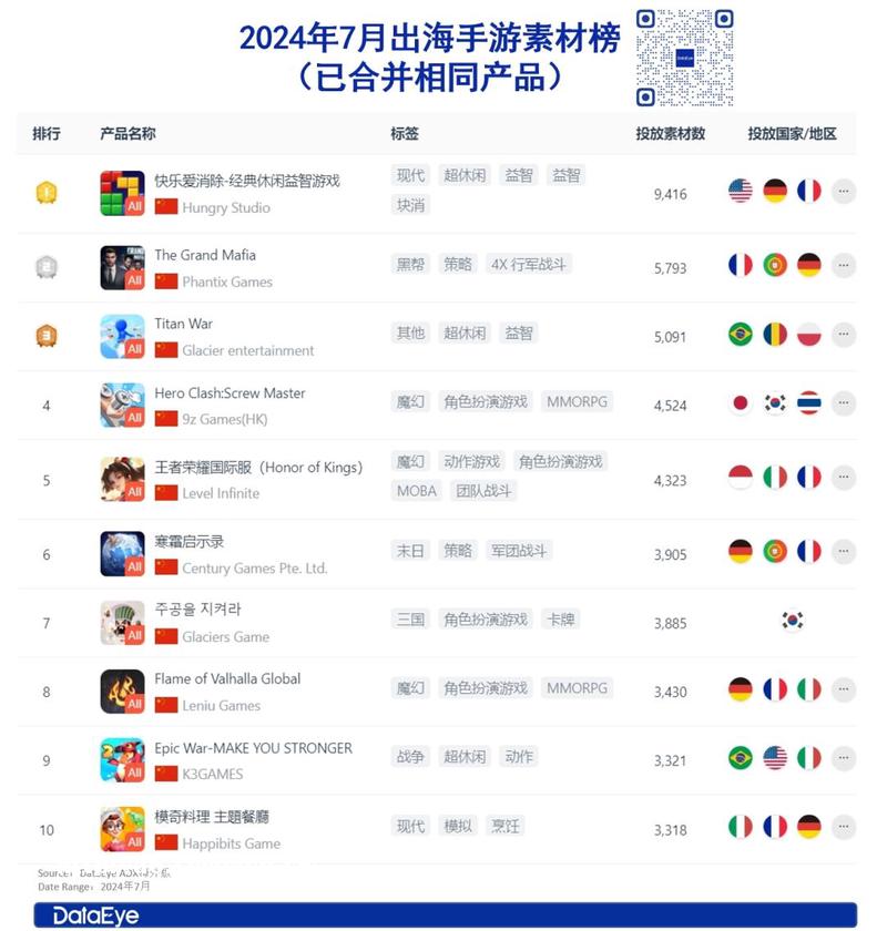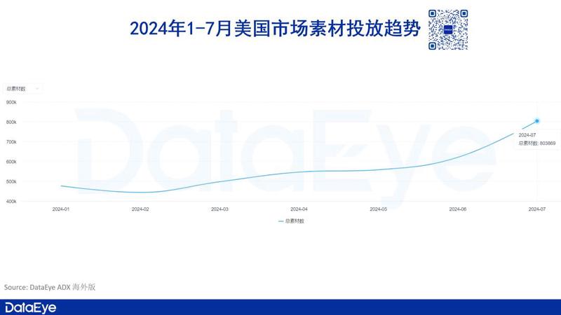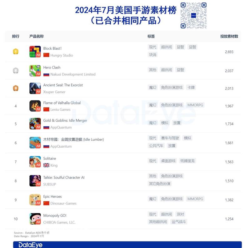 7月份登陆美国市场的《Ancient Seal: The Exorcist》和广州乐牛游戏的《Flame of Valhalla Global》等新游也进行了积*投放,共同推升了总素材量的上升。