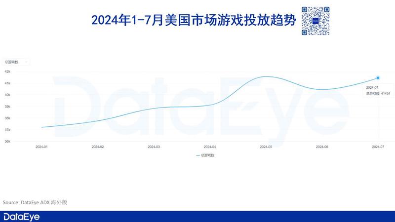 在2024年10月份,美国市场的素材投放量突破了80万,也是2024年以来素材投放量最多的单个月份。素材量的上升与9月份美国市场投放游戏数量的环比增加呈正相关关系。