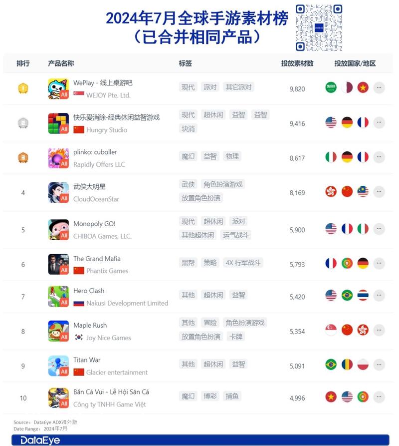 2024年7月全球手游素材榜:排在**的是中国微派的派对游戏《WePlay》,在6月份投放素材数达到了9820(视频+图片,去重),中东、中国港台和***是主要的投放市场。