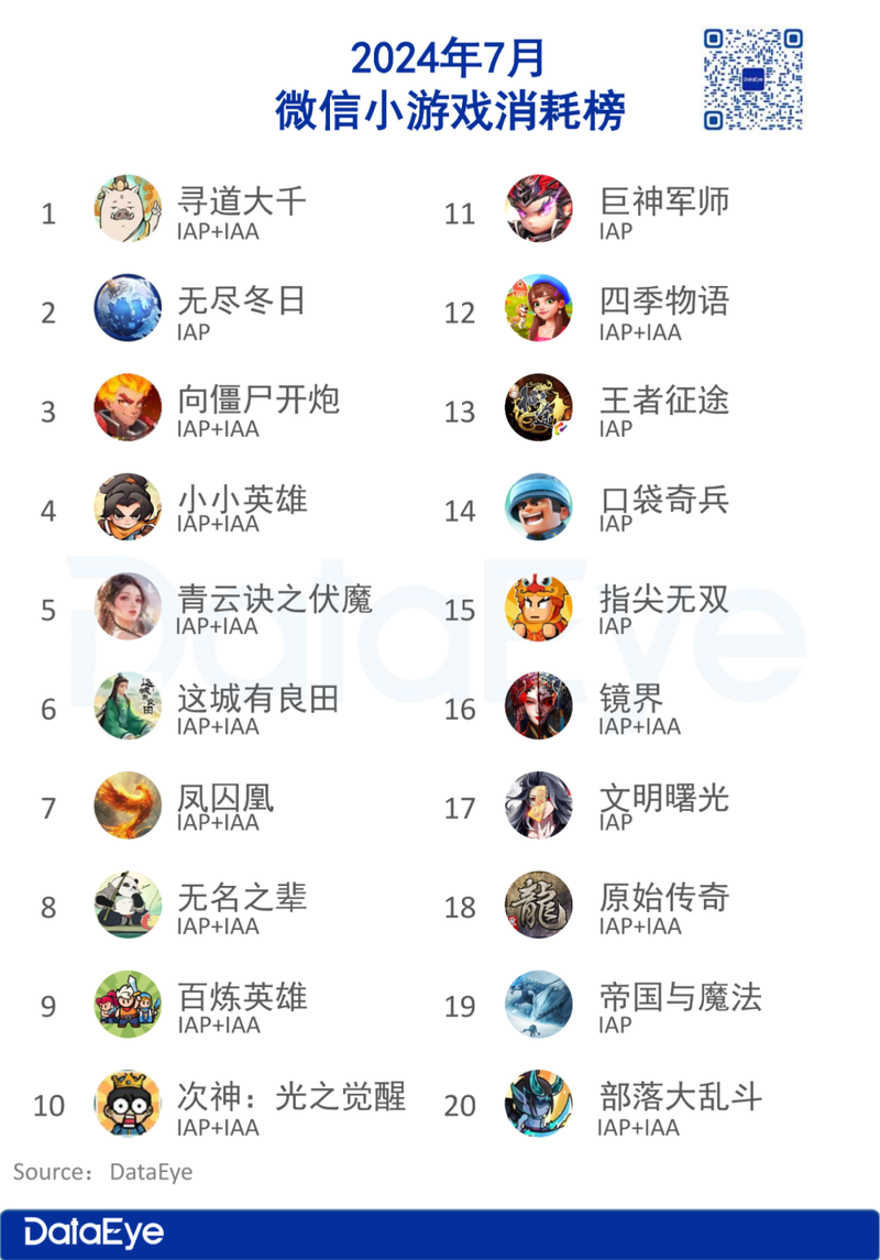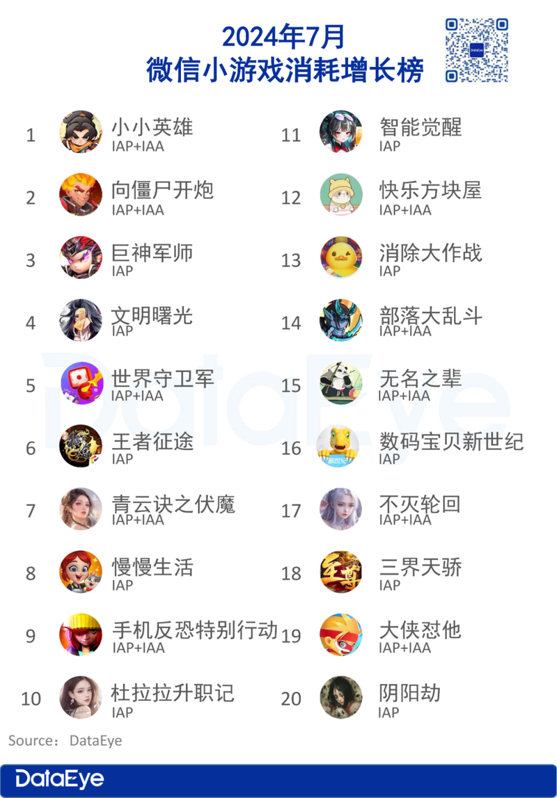 DataEye研究院认为,一方面体现出市场仍在不断**,市场高速发展态势持续;另一方面来看,消耗榜***20乃至消耗增长榜***20的产品品类多元,意味着小游戏市场仍呈现持续扩大的趋势,能够让小游戏多款不同品类的产品同时跑出,不存在固化情况。
