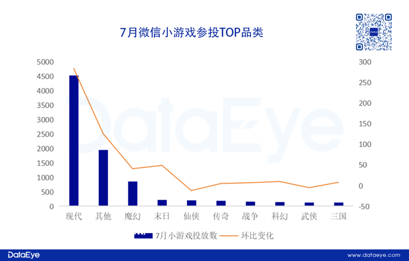 休闲、益智、消除占比位列前三,而且均有相对明显的投放数量增长。题材***10分类中,现代题材占比**,其他题材排名第二,魔幻题材排名第三。头部品类基本维持不变。