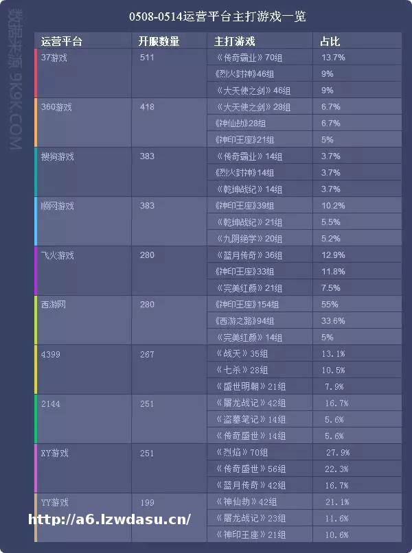 点评:本周运营平台开服排行前三:37游戏、360游戏、搜狗游戏;飞火游戏和西游网排名互换。本周榜**台共开服3223组,占一线平台开服总数57.2%,与上周基本持平;其中开服前三平台共开服1312组,占榜单开服总数40.7%。