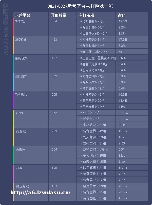 点评:《蓝月传奇》本周开服数略有减少,但整体开服形势稳定,其在顺网游戏等多家平台的开服占比稳定在5.8%。
