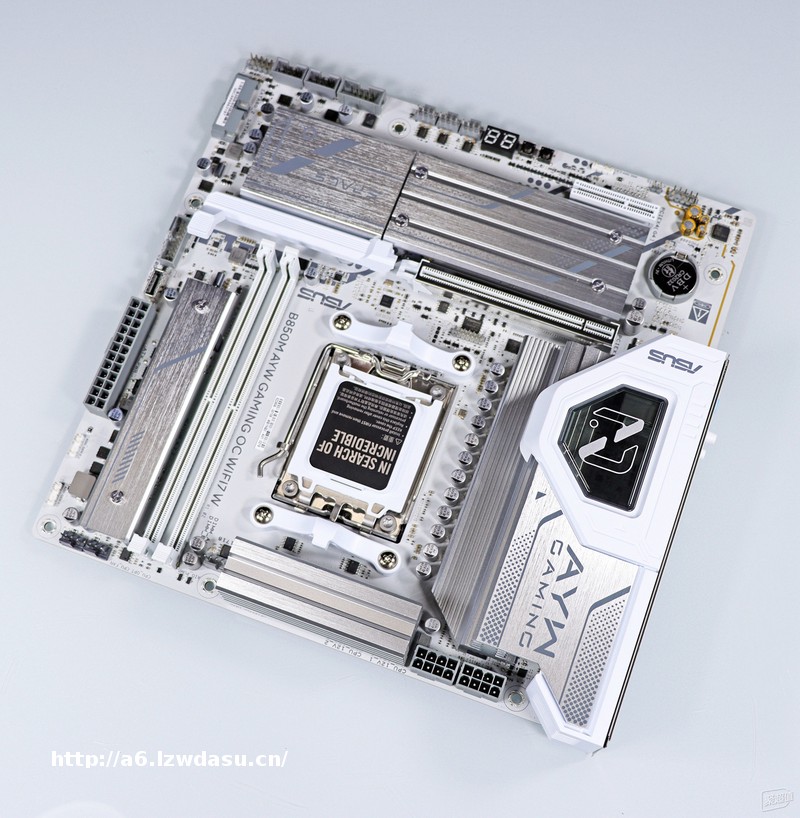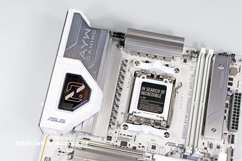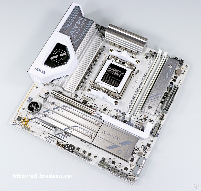 ▲ B850M AYW OC 的配采用白为主调,搭配上金属浅调的散热模组涂装,让整体十分契合白系恬静的风格,让人一眼倾心。散热模组在不同的光照角度下会呈现银白到灰的渐变,让主板多了些变化。