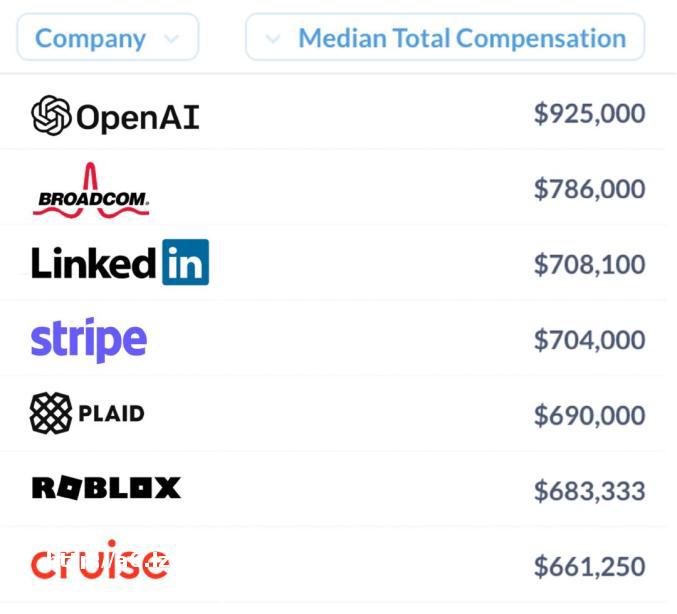 fyi网站近日发布了2023年上半年的全球程序员收入报告。报告显示,上榜的主管工程师的总薪酬中位数均在66万美元以上,较去年有大幅度提升。其中,OpenAI以高达92.5万美元的总薪酬中位数位列**,而去年它还只是个“无名之辈”。这一天价薪酬主要针对10年工作经验的软件工程师,其薪资结构包含:30万美元的基本工资+62.5万的“股权”。其中,“股权”并非按照每年度发放,而是员工以每4年为一个周期进行领取。