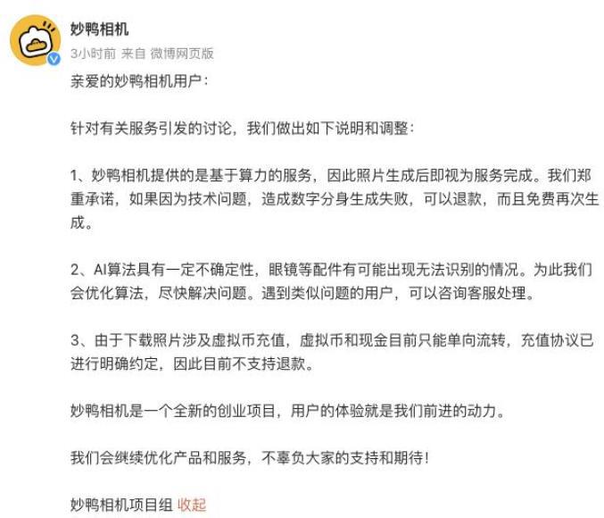 今日,当红的AI小程序妙鸭相机针对服务引发的讨论做出了三点回应:“1、妙鸭相机提供的是基于算力的服务,我们郑重承诺,如果因为技术问题,造成数字分身生成失败,可以退款,而且免费再次生成。2、AI算法具有一定不确定*,眼镜等配件有可能出现无法识别的情况。为此我们会优化算法,尽快解决问题。遇到类似问题的用户,可以咨询处理。虚拟币和**目前只能单向流转,充值协议已进行明确约定,因此目前不支持退款。”