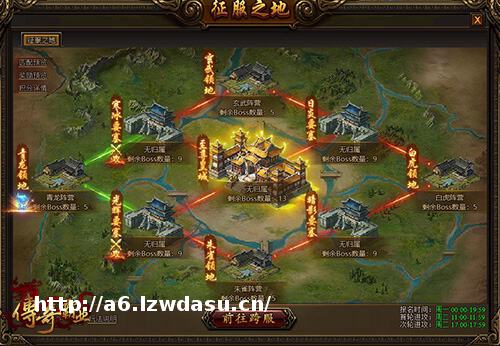 “征服之地”战场划分青龙,白虎,朱雀,玄武4大阵营,同时拥有9座城池,4座阵营出生领地、4座要塞和至尊皇城。参与活动的玩家可以通过击杀城池内的BOSS获得BOSS掉落奖励和该城池的领地积分。