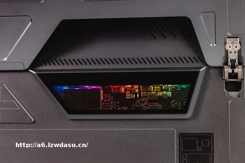 这次 ROG 干脆在机身背后挖了一块**窗,在里面按上灯珠,在开机状态下,可以很清楚从外面的看到主板上的炫彩的组件。
