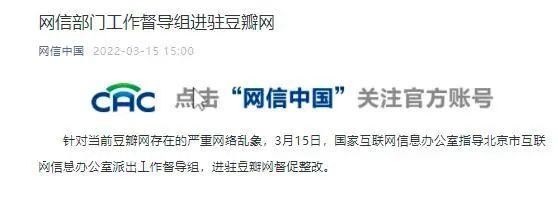 3月22日,针对当前豆瓣网存在的严重乱象,今日,**互联网信息办公室指导北京市互联网信息办公室派出工作督导组,进驻豆瓣网督促整改。