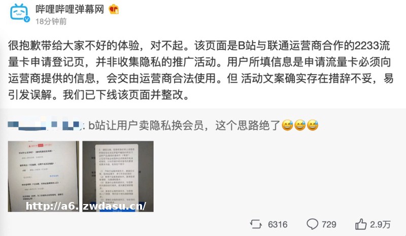 13日,针对有网友发文质疑B站让用户卖**换会员一事,用户信息会交由运营商合法使用。活动文案措辞不妥,已下线该页面并整改。(北青网)