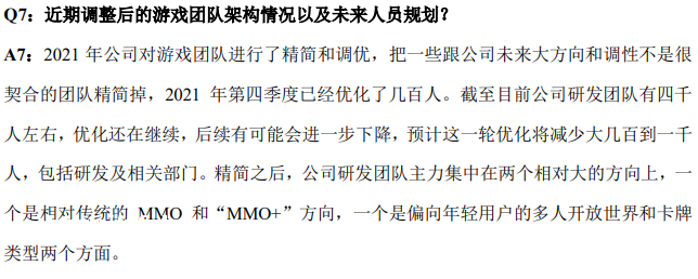 因为产品表现不及预期和为了聚焦核心项目,并表示优化人数可能会进一步增加几百至一千人。在**者会议上,公司表示“2021年公司游戏业务处于转型期,由于新老游戏衔接、人工成本增加、以及被**企业损益等原因,使得业绩出现阶段*压力”。不仅如此,