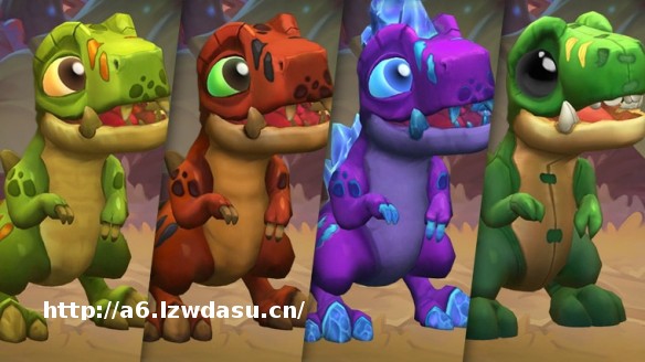 暴龙王克鲁什的经典皮肤看起来凶巴巴又绿油油的。随着等级的提升,它可以解锁三个额外皮肤:魔暴龙克鲁什、紫水晶克鲁什、抱龙王噗鲁什。