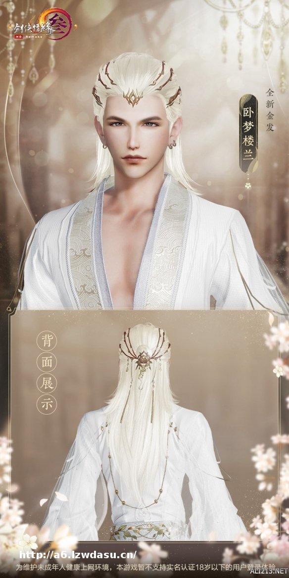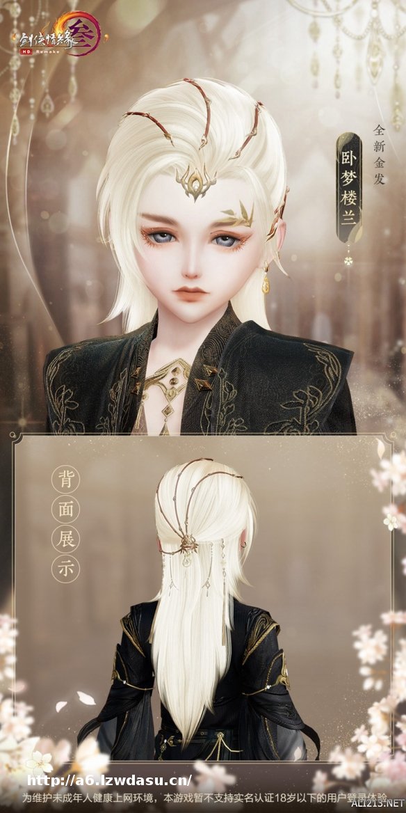 少年平生多英气,快马直欲斩楼兰,全新金发“卧梦楼兰”今日与诸位侠士首度见面!本款金发均采用长发款式设计,彰显侠士潇洒大气、风度翩翩!成男款鎏金额饰点缀,长发随红玉发饰束于身后,更显简约雅致;成女款优雅婉约,两缕额发洒落, 长发盘起,淡粉珠簪相点缀,端雅淑女显跃眼前;萝莉款甜美可人,蕾丝发箍相束,两股青丝扎成的双马尾系于身后,少女的灵动之气活现;正太款长发翩翩潇洒自然,额前碎发散落,搭配金红发饰更显少年英气不凡!