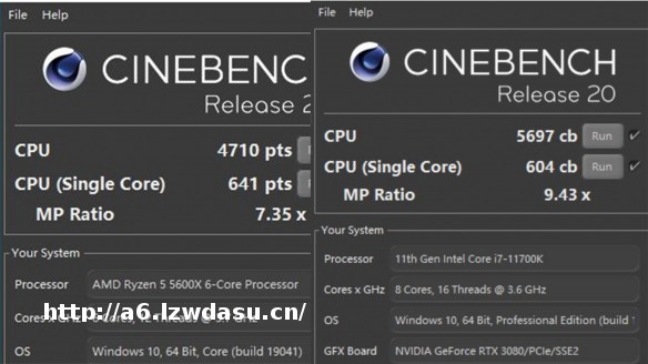 CinebenchR20的情况也比较类似,5600X的641单核*能分远远强于11700K的604分,而多核方面,5600X取得的4710分和11700K的5679分,与刚才的CinebenchR15测试的结果较为类似,显然这是缺少两个核心的结果。