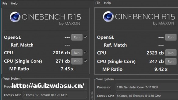 在CinebenchR15中,5600X以271的单核成绩胜于11700K的247分,而多核跑分中,由于5600X少了两个核心拿到了2016分,所以11700K 2323分小胜一筹。