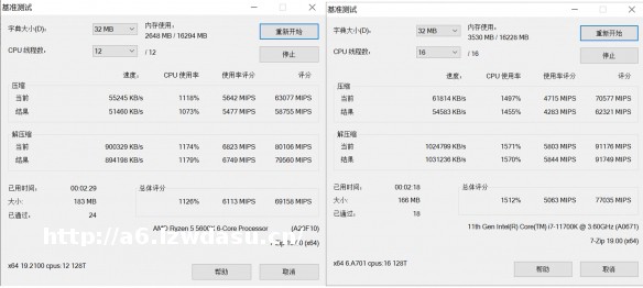 最后一个项目为7Zip基准*能测试,7Zip测试是不断地利用CPU进行压缩与解压缩工作,这一项目二者的得分比较接近,11700K 77000分,5600X也约7万分的成绩,我们看到二者在进行测试时,软件调用的线程数是有差别的,11700K比5600X多使用4个线程,显然如果我们把11700K调用的线程数调为12,那么5600X的成绩将会拉开差距。