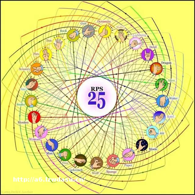 如果你觉得剪刀石头布对你来说还是太过轻松,不如试试剪刀石头布的各种升级版本。在原有的双人对战基础上,剪刀石头布还可以有更多新玩法。“左一拳,右一拳,然后收起来一拳!”这个口诀想必也是许多人的童年回忆杀。另一个思路则是为原有的石头剪刀布增加选项,比如生活大**里的“石头、剪子、布、蜥蜴、史**”。蜥蜴的手势就是蜥蜴头,而史**的手势则是**的瓦肯举手礼,很多人要费很大劲练习一段时间才能做出来,具体玩法见下图: