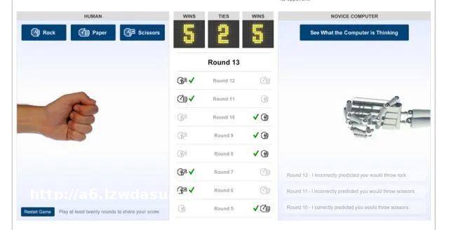“一共就三个手势,大家都是凭感觉出,这玩意儿上哪里找技巧?”这样说倒是也没毛病,如果每一次出拳都是真正的随机**,那我们就的确没什么继续讨论的必要了。然而,当我们把*数增加,两个人要连续对弈五次甚至更多的时候,无论你有没有意识到,潜在的策略都已经萌芽。