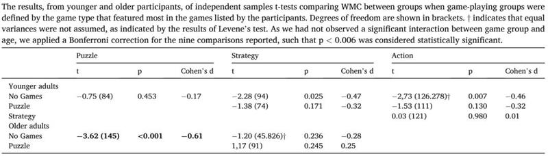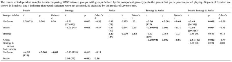 对于青年人,我们观察到策略游戏玩家的工作记忆容量优于非玩家,但对于老年人,拼图游戏玩家表现出更好的工作记忆容量。老年拼图游戏玩家的工作记忆容量与青年玩家或非玩家相当。玩游戏所花时间的差异并不能解释这一点。不论玩什么类型的游戏,老年游戏玩家花费的时间都明显比青年游戏玩家更长。尽管工作记忆表现优越的老年人可能更有可能玩拼图游戏,但也有可能玩拼图游戏可以改善工作记忆,适当的训练可能会使青年人和老年人获得相等的训练增益。