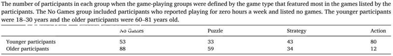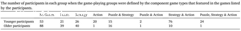 得到了下表中描述的各组。由于动作游戏组的老年参与者少于20人,