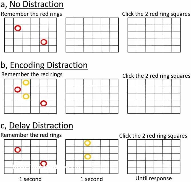 共有七个条件,其中三个与本研究有关。参与者被要求记住在一个5×6的网格上出现的红色圆圈的位置,持续1秒钟。在每个试验结束时,他们会看到一个空的网格,并被要求点击红色圆圈出现的网格位置。当他们犯错误时,他们会立即得到通知。在所有条件下,都有一个持续1秒钟的延迟期。在“无干扰”条件下,只显示红色圆圈。在ED条件下,会同时显示两个**的干扰圆圈和红色圆圈。在DD条件下,会在延迟期间显示两个**的干扰圆圈。对于每个条件,红色圆圈的数量(WM)从两个开始,每次回答正确的试验都会增加一个红色圆圈,直到参与者在一个条件的两次连续试验失败为止。通过这种方式,其中**次当作练习。